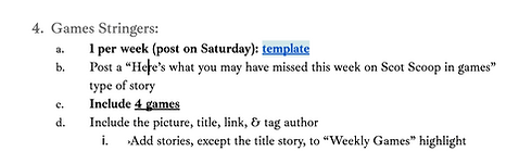 Above are the directions I made to instruct our team of producers on how to create promotional stories using the templates I created. To the left is an example of a Games Stringer made using the template.